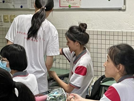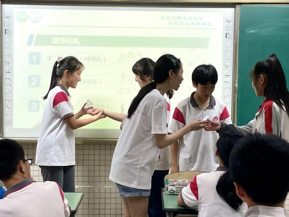 高任诘首先向同学们介绍了地震的成因,并借此引出了地震预警的原理、解释了地震不同的预警声音所代表的不同含义。随后详细介绍了地震发生时的一些急救常识,徐诗淇、弋梦琪向大家演示了止血包扎的基本方法。同学们都踊跃参与其中,并有不少同学主动上台演示学习成果。